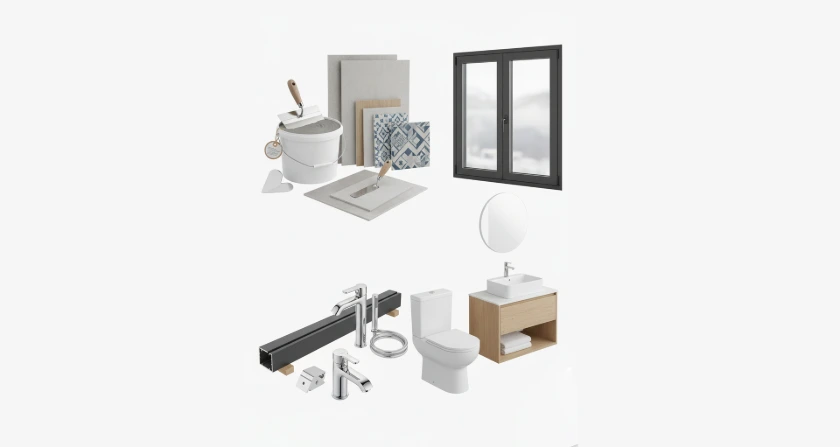Suministramos desde morteros, revocos y revestimientos hasta griferías, mobiliario, carpintería de aluminio, puertas y ventanas.